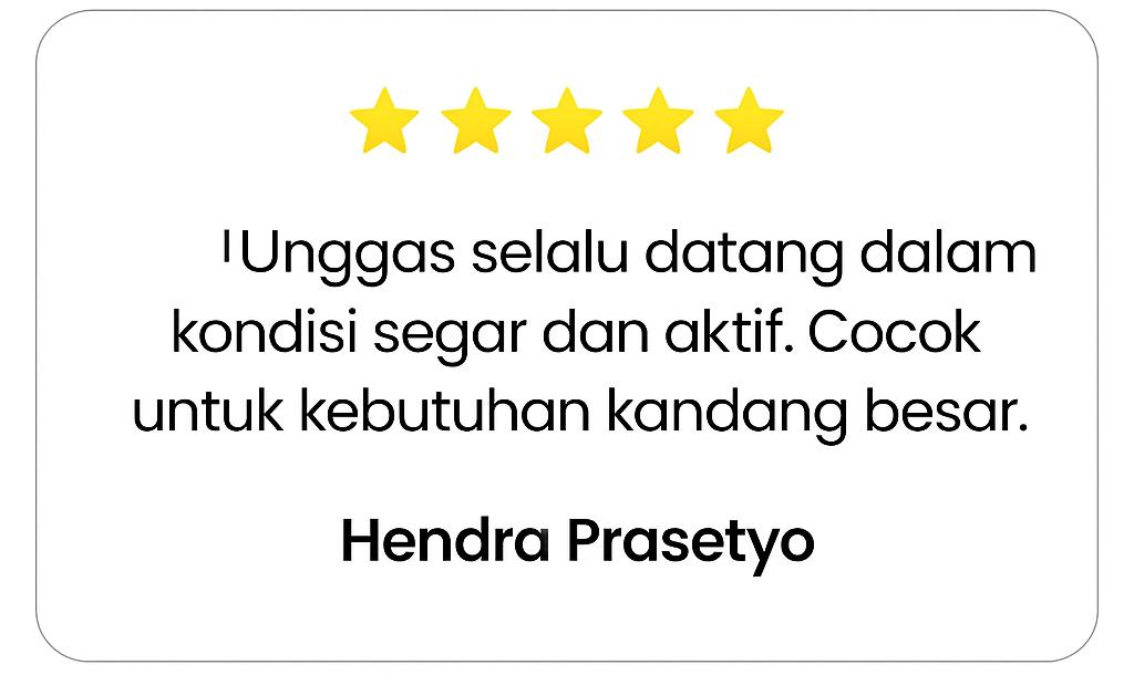 Kami melayani pengiriman ke seluruh wilayah Indonesia dengan sistem pengemasan aman dan pengawasan langsung agar unggas tiba dalam kondisi sehat dan siap ternak.